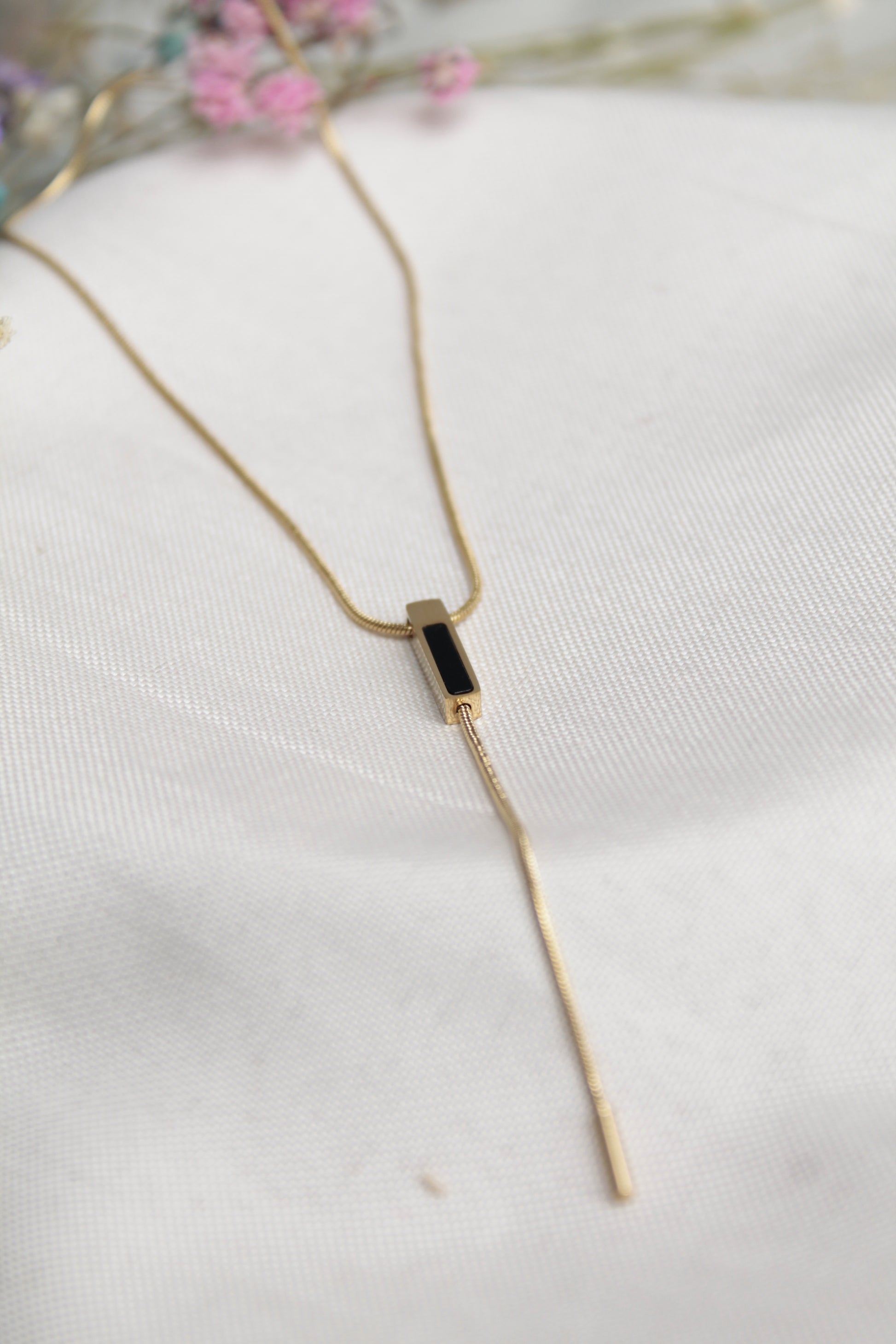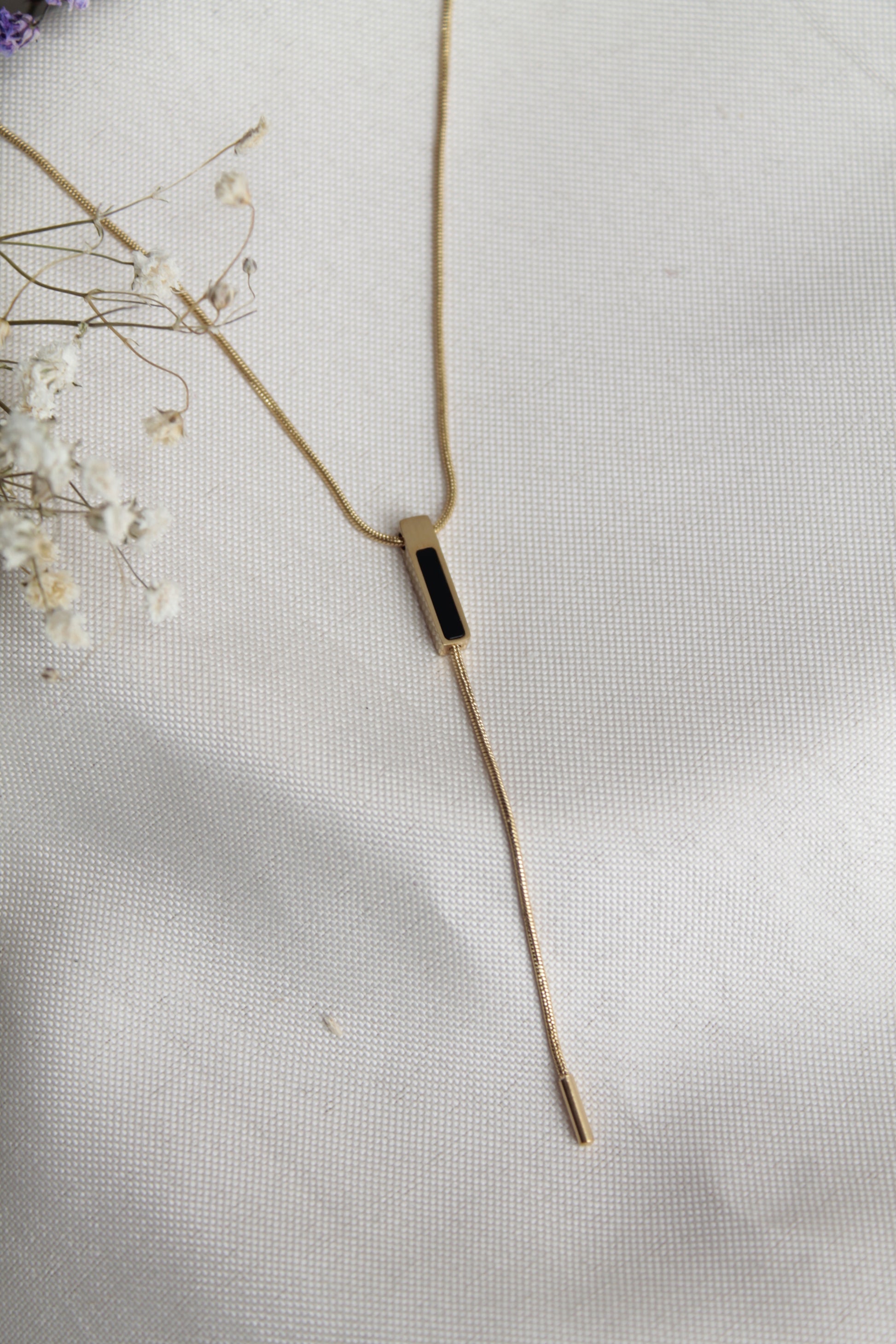 El Collar Irene presenta un diseño estilizado con cadena dorada tipo serpiente y un colgante rectangular negro que aporta contraste y sofisticación. Su detalle colgante alargado añade movimiento y lo convierte en una pieza ideal para complementar looks elegantes y contemporáneos.