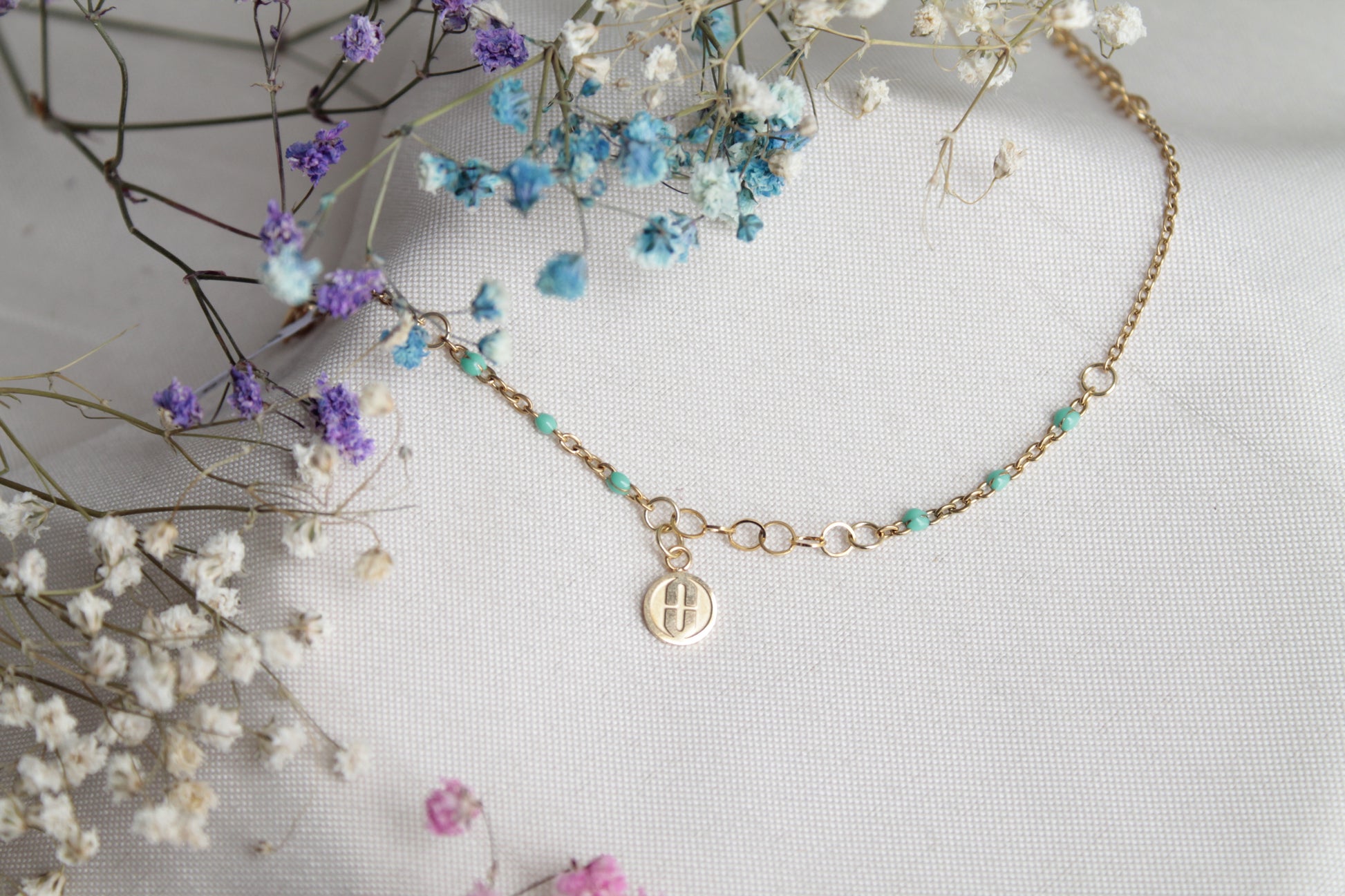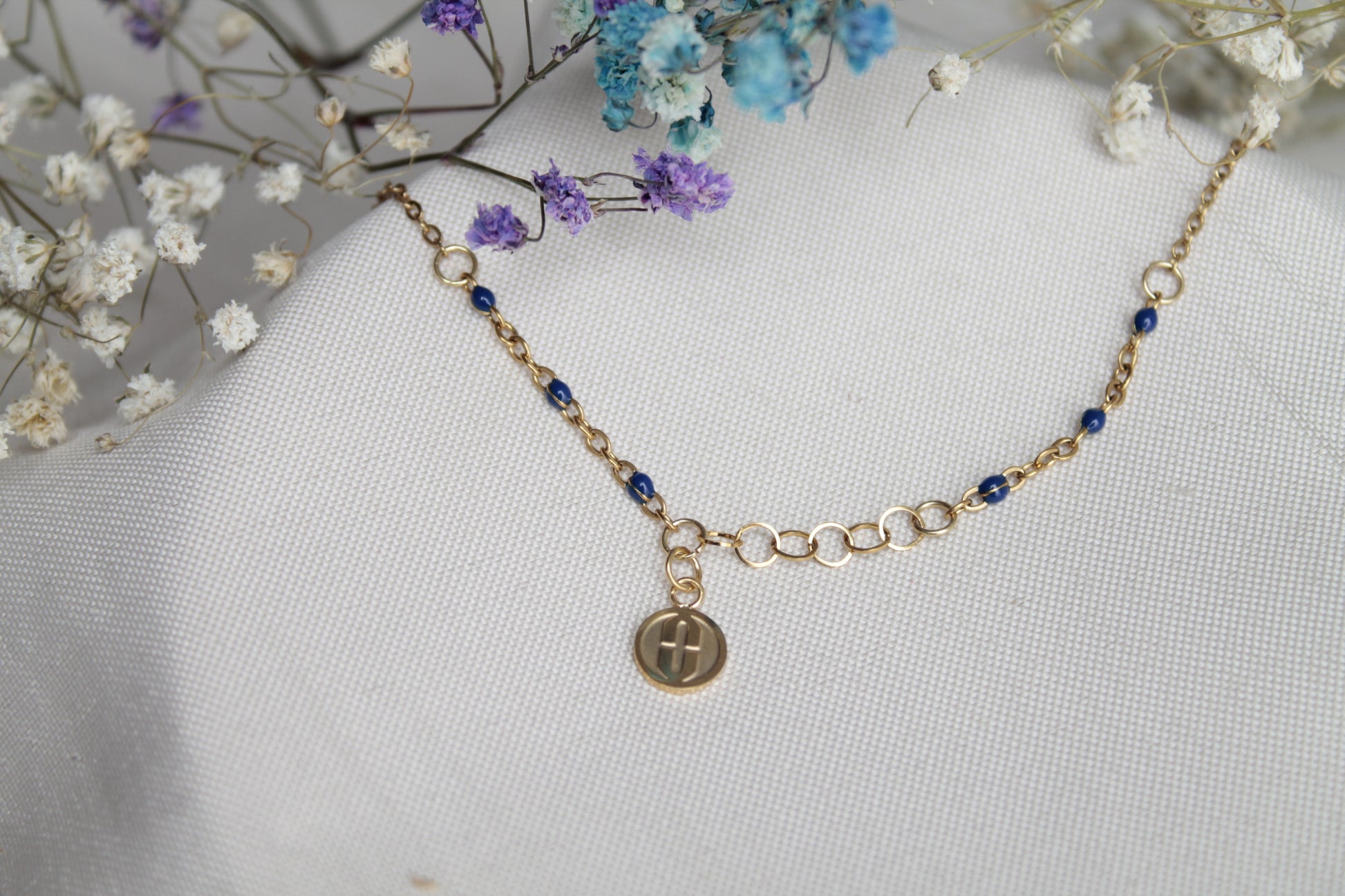 Llena tu look de color con la Pulsera Colores, una delicada cadena dorada adornada con cuentas esmaltadas en tonos vibrantes y un dije circular calado. Disponible en combinaciones azul y turquesa, es el accesorio perfecto para dar un toque alegre y moderno a tu estilo diario.